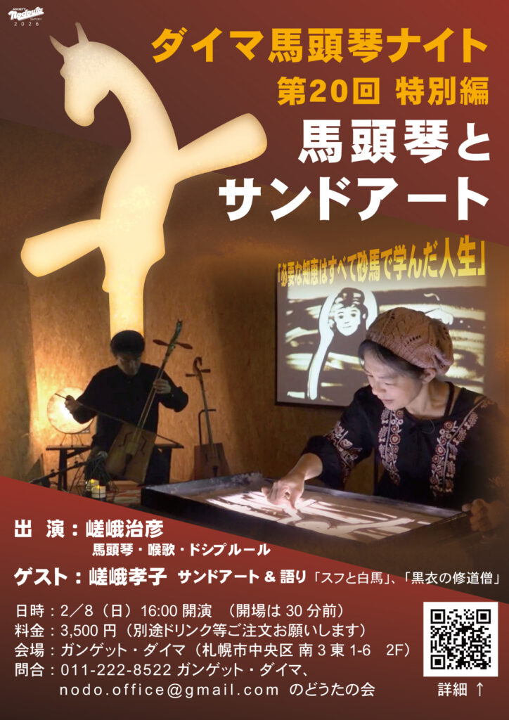 というわけで、第20回記念としてゲストに野花南の相棒でもある嵯峨孝子さんを迎えまして、ダイマ史上初となるサンドアート・パフォーマンスを交えてのスペシャルライブを開催させていただきます。(サンドアートは待望の新作発表も)冬真っただ中ですが、どうぞダイマで、ホットワインなど片手に、馬頭琴と砂絵のライブをお楽しみください。