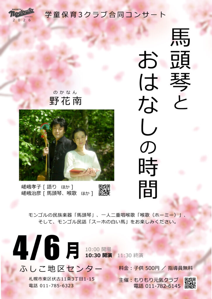 ライブ・イベント 4/6(月)子供のための馬頭琴コンサート in ふしこ 2026年3月1日 special thanks to 櫻井ヒロ 日時2026/4/6(月) 会場ふしこ地区センター(札幌市北区)料金(関係者対象)出演嵯峨治彦 (馬頭琴・喉歌 ほか)嵯峨孝子 (朗読) スケジュール元気もりもりクラブ子供のための馬頭琴コンサート朗読櫻井ヒロ野花南 前へ… ライブ・イベント …次へ 前へ… すべての記事 …次へ